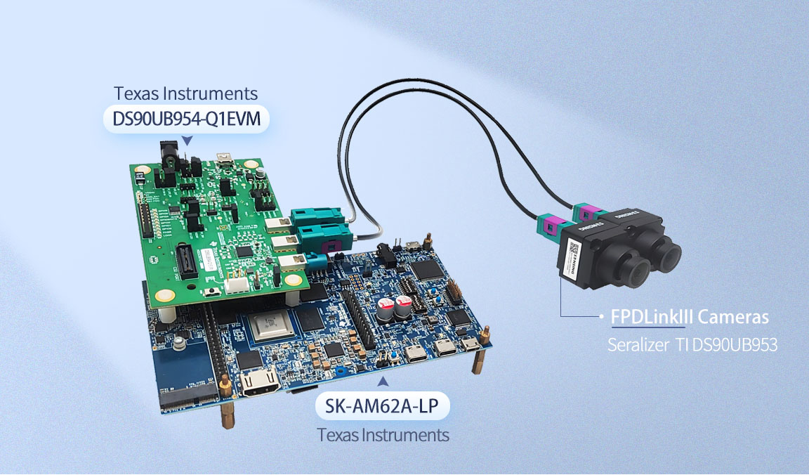 此次,基于TI AM62A套件推出了FPDLink III摄像头,利用解串板评估模块(DS90UB954-Q1EVM)的FPDLink III接口,可同时连接2个FPDLink III摄像头,将高质量图像传输至 TI的 AM62A AI 视觉处理器上并实现平稳高效运行。