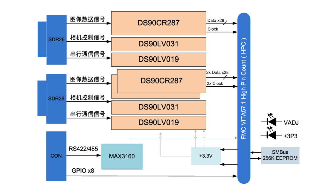 CameraLink发送 FMC 子卡模块,该模块支持2路CameraLink Base模式或者1路CameraLink Full模式的图像信号输出。板卡具有2个CameraLink端口(SDR26),可以作为 模拟 相机的输出。