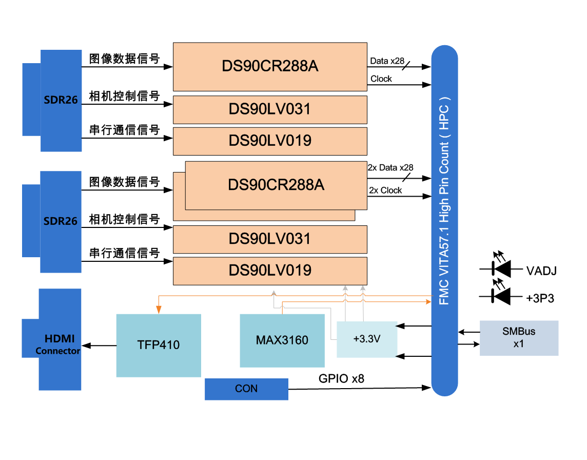 基于FMC接口标准的1路CameraLink Full模式(或者2路CameraLink Base模式)采集、1路HDMI(DVI)视频输出的子卡模块,该模块具有2个CameraLink端口(SDR,26PIN),可通过硬件配置成1路Full输入或者2路Base模式输入,CameraLink接口支持80Bit Deca模式(即Full Plus模式)。该模块支持1路DVI视频输出(HDMI连接器),最大支持1080P分辨率。 该模块专门为FMC夹层卡设计,通过搭配不同的FMC载卡,可快速搭建起基于CameraLink视频接口的影像分析验证平台。可广泛应用于教学科研和高端视频图像产品的研制。