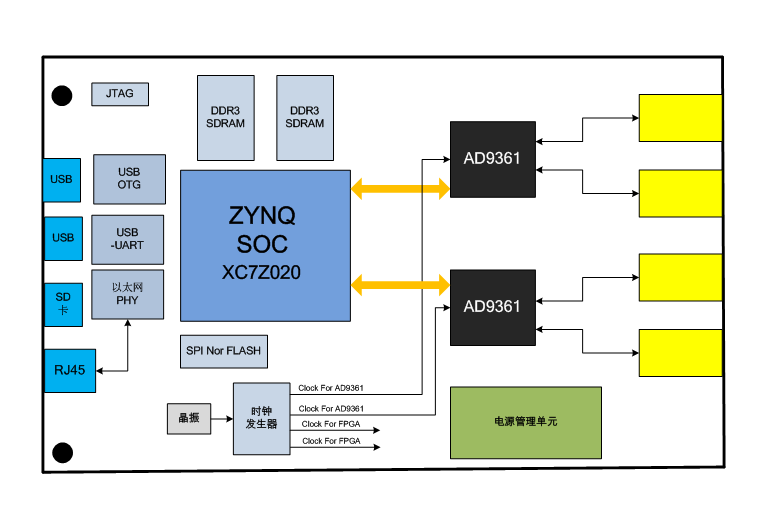 • 板载2片AD9361射频收发芯片,兼容AD80305