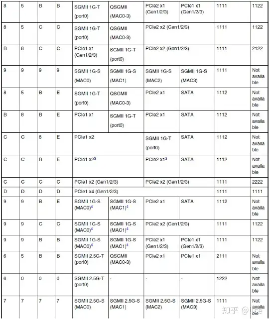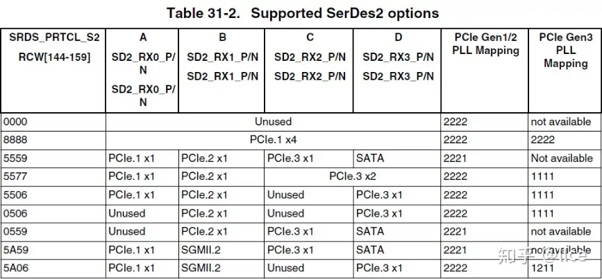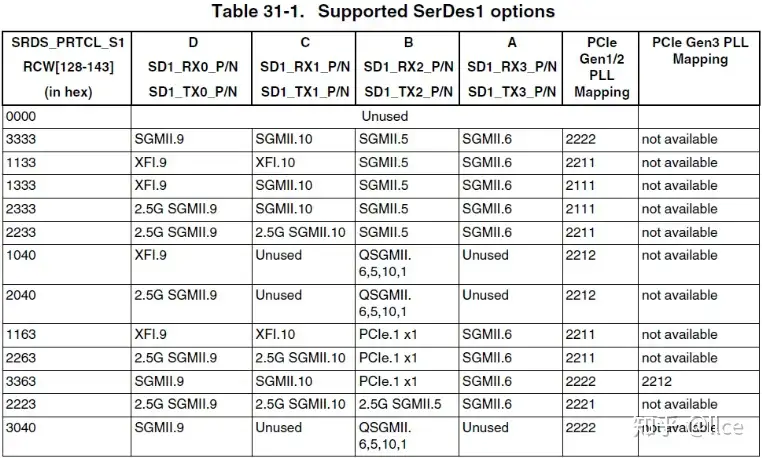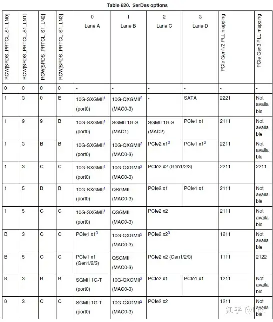 第一列是RCW位,只能在这些选项中选择方案(所以不存在8条lane都配置成网口这种操作);后面ABCD列代表硬件上的信号名称和接口功能;最后两列是PLL的配置,需要注意Mapping这个词,表示你需要配置PLL1还是PLL2,举例:2222代表ABCD4条lane都使用PLL2,2211代表AB lane使用PLL2,CD lane使用PLL1,not available代表此方案不支持PCIe Gen3速度。