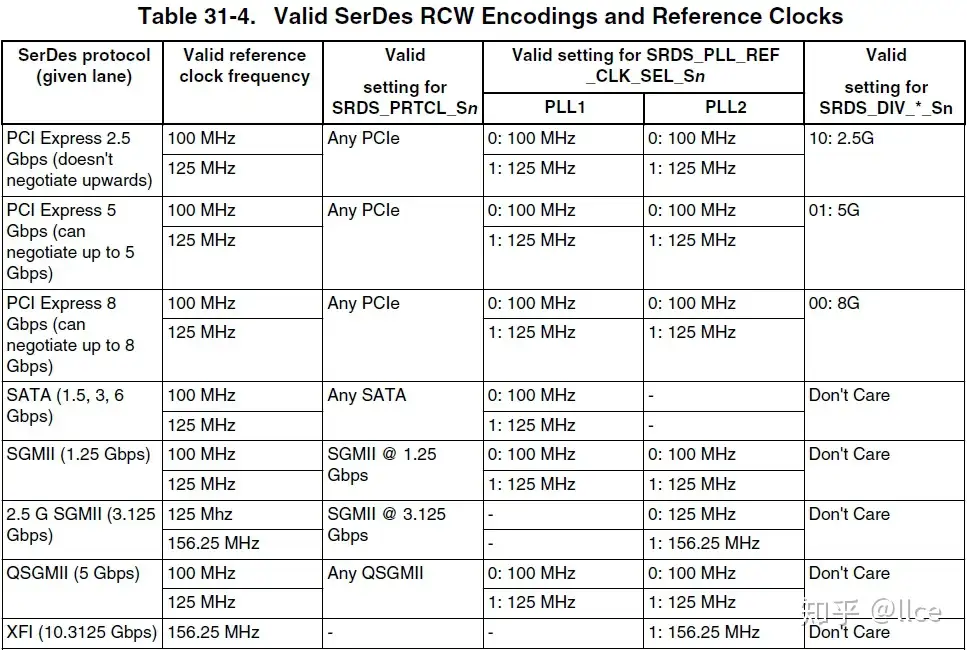 SerDes2只有PCIE、SATA、SGMII(1.25G)的功能,这三个功能都可以参考100MHz时钟,那么我们的核心板上硬件已经固定死100MHz,只需要软件去选择PLL即可。