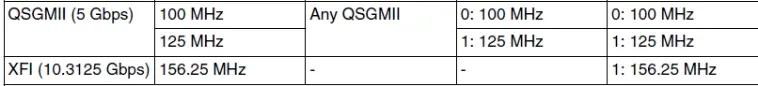 SerDes1有SGMII(1.25G),SGMII(3.125G),QSGMII,XFI,PCIE功能,我们看Table31-4表中这些功能的PLL1都可以设置为100MHz,所以我们在核心板中硬件固定死100MHz,PLL2可以参考100MHz和156.25MHz即可实现全部功能,我们从核心板引出一个SD1_REFCLK_SEL引脚,用于选择100M,156M,然后软件配置相对应的PLL即可。