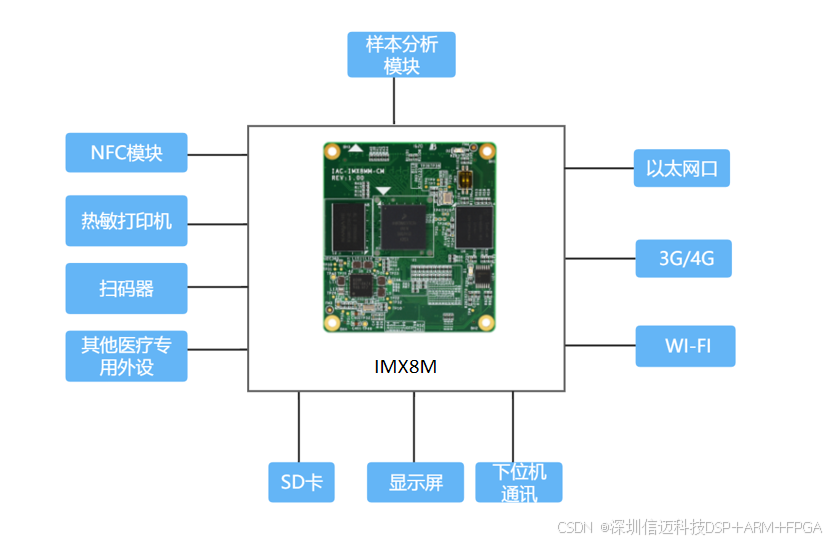 信迈基于四核Cortex-A53平台的IMX8MM核心板作为医疗POCT仪器的主控板,核心板基于NXP i.MX8M mini 4*Cortex-A53+Cortex-M4处理器,高性能、低功耗,主频可达1.8GHz,可配备大容量内存,为医用设备提供足够的硬件资源支撑。