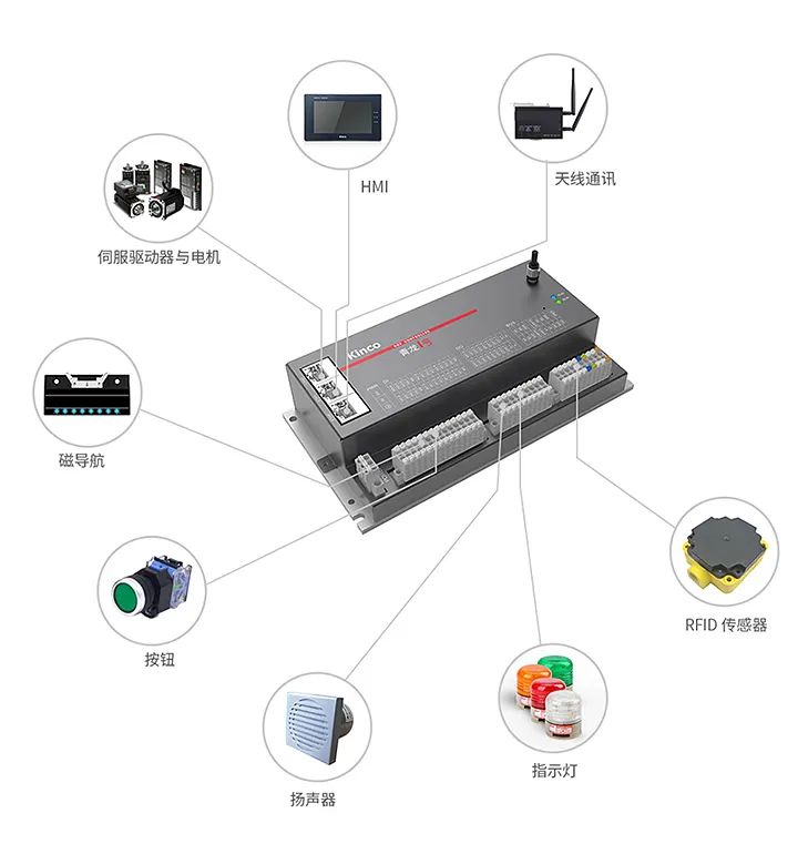 “青龙1号”控制器使用ARM Cortex A9 667MHz处理器,支持2路CAN总线主站,2路以太网口;支持4路RS485,一路 RS232 口;集成24路数字输入口,16路数字输出口;内置预留可扩展WIFI通讯模块;集成AGV差速运行、轨迹规划等基本函数库。除了可以外接RFID、扬声器、磁导航等智能传感器以外,还可以实现基于PLCopen标准编程的运动控制。