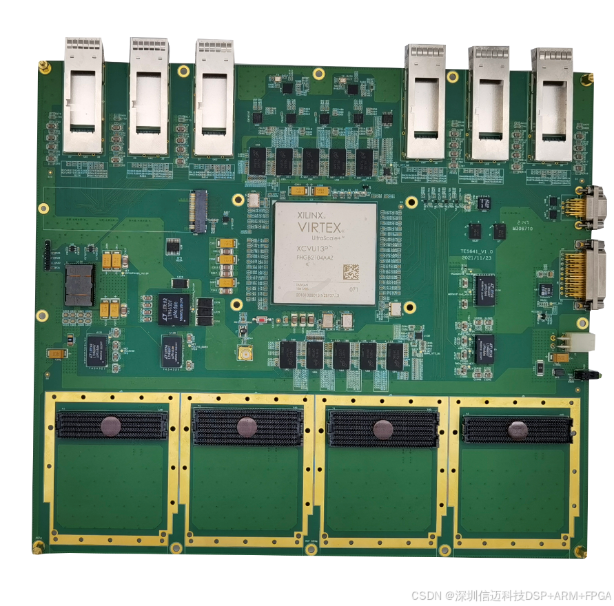 基于Virtex UltraScale+系列FPGA的高性能4路FMC接口 基带信号 处理平台,该平台采用1片Xilinx的Virtex UltraScale+系列FPGA XCVU13P作为信号实时处理单元,该板卡具有4个FMC子卡接口(其中有2个为FMC+接口),各个节点之间通过高速串行总线进行互联,该FPGA支持最大32Gbps的高速串行总线,适用于100G以太网、JESD204B/JESD204C等高速接口。板卡采用嵌入式非标结构,具有优良的抗振动设计、散热性能和独特的环境防护设计,适用于超带宽基带信号处理、多路AD/DA等同步采集处理等场景。