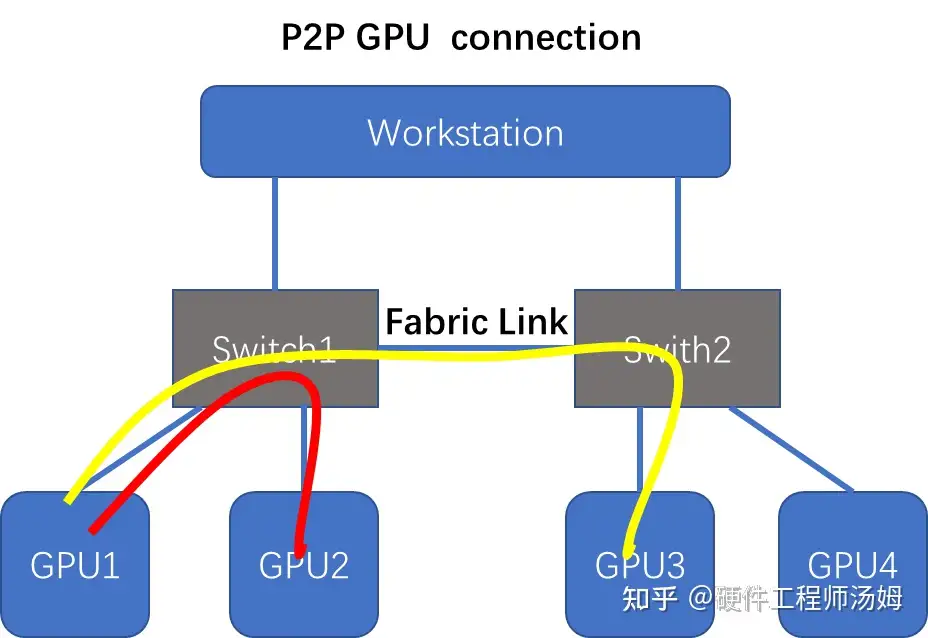 GPU1 can communicate with GPU3 using switch1 through a fabric link to switch2.