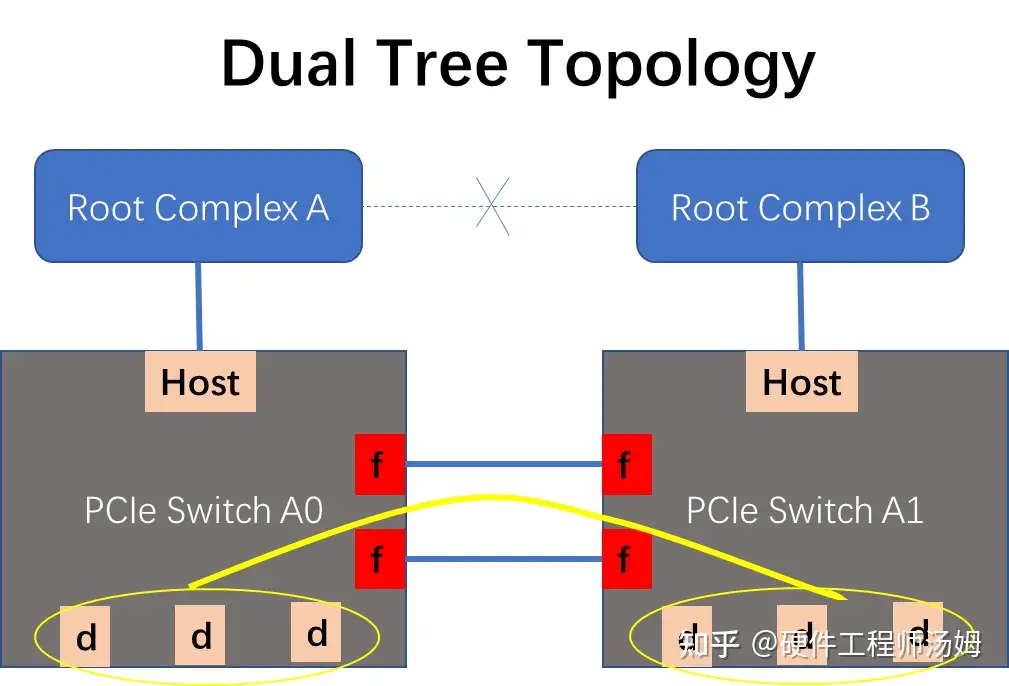 In the PCIe tree topology example that follows, the root complex connects on the upstream side to a host port on the A0 PCIe switch. The A0 PCIe switch connects through fabric (f) ports to B0, B1, and B2. Downstream (d) ports connect to standard PCIe devices (not shown in the figure). A standard PCIe device could be an endpoint or another set of switches that lead to a set of endpoints.
