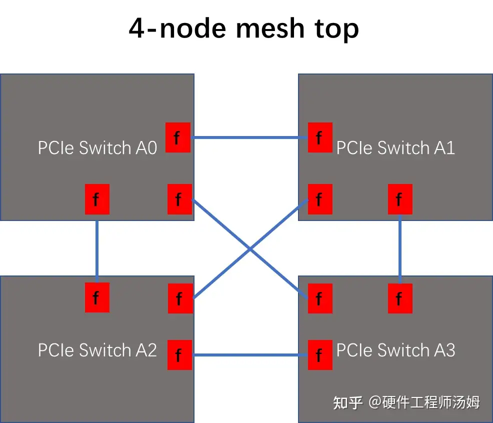 A mesh topology connects every node to every other node. The dual switch topology shown in Dual Tree Topology is a 2-node mesh. The PCIe switch supports up to a 13-node mesh. The figure that follows shows a 4-node mesh topology.