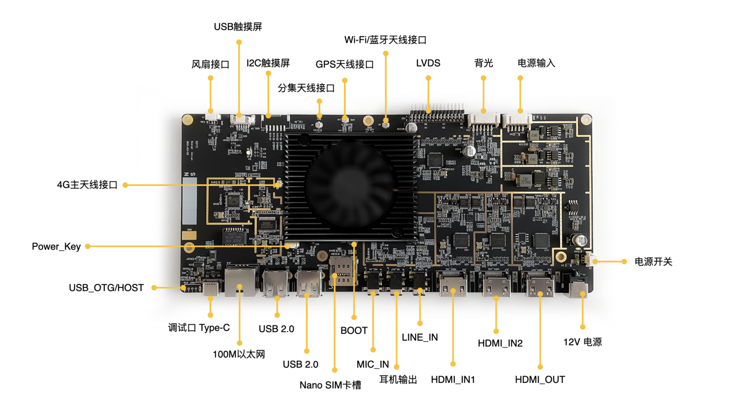 HDMI IN、HDMI OUT、USB-A 3.0 x 4、串4路、TTL 3.3V 、麦克风、耳机、电池接口