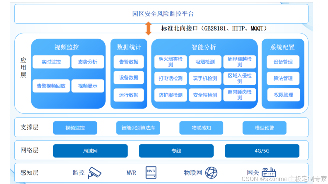 支撑层为应用层的主要能力支撑,包括视频监控、智能算法仓库、其他物联感知数据及告警 模型 的建立,为未来更智慧化的业务应用和管理需要提供能力支撑。