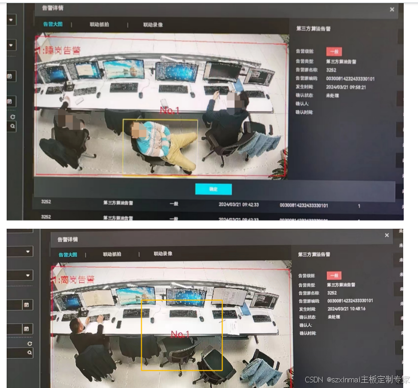 人员离岗睡岗检测是指在监控场景中预先设定监测区域,当监测区域内发现人员离岗睡岗时触发告警。检测目标在1080p图像中的分辨率大小不小于30*30像素。离岗睡岗时间阈值可自定义。