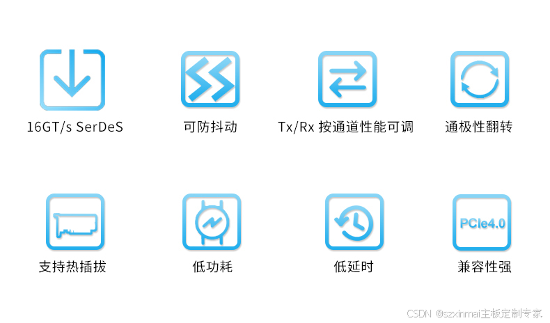 · 高性能 16GT/s SerDeS , 可补偿高达 28dB 的信道损耗;