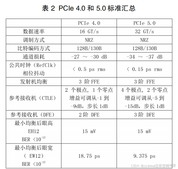 表 2 总结 PCIe 4.0 和 5.0 SerDes 要求之间的差