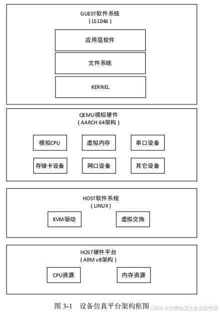 设备仿真平台的 QEMU 模拟硬件模块架构如图 3-2 所示,主要分三个层面: