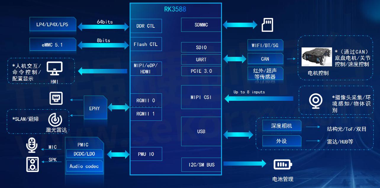 SDIO/UART/PCIE 3.0支持通过这些接口开发或连接WiFi模块、蓝牙模块、5G模块等,实现无线通信功能。同时,支持CAN接口的开发,用于电机控制等。