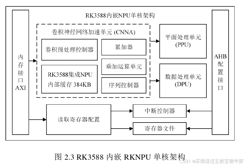 AI芯片模组RK3588内部集成ARM架构八核64位中央处理器(Central Processing Unit, CPU),大小核结构分别为四核Cortex-A76与四核Cortex-A55以及单独扩展结构NEON协处 理器。重要地,芯片内部集成嵌入神经网络处理单元(Neural-Network Processing Unit, NPU), 针对神经网络模型包含矩阵乘法、卷积操作与激活函数等运算,及其大规模并行计算需求, NPU拥有性能高度优化的精简指令集以及定制化的集成电路硬件加速运算设计,支持int16、 FP16与TF32等数据类型的混合运算。NPU单核架构如图2.3所示。