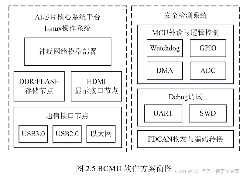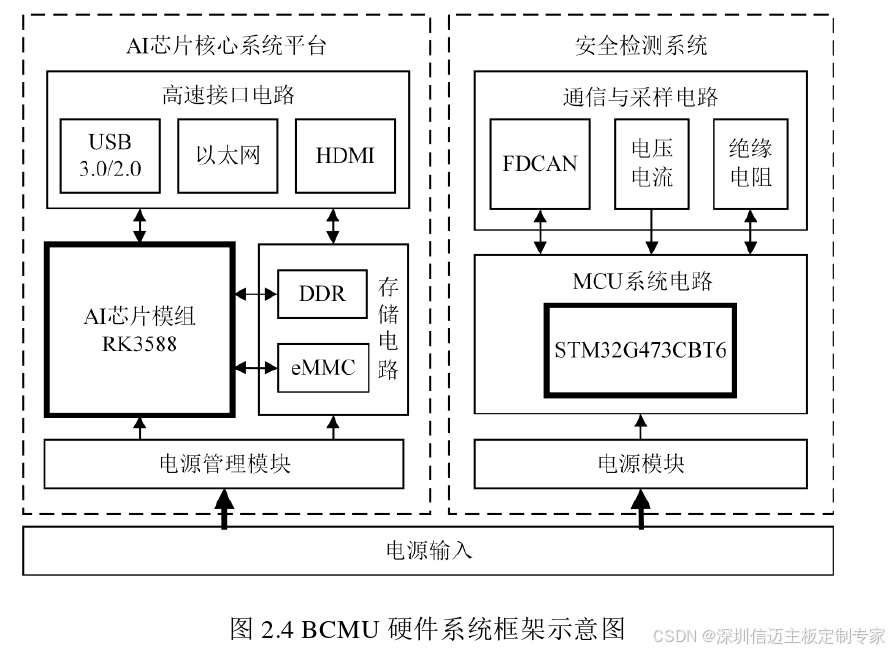 针对储能电站总体管理系统结构方案中BCMU边缘端AI应用,根据上文中系统的需求 分析以及详细功能描述,BCMU硬件系统需要AI芯片模组适配硬件系统以实现处理器运算 存储操作,配置外部接口电路以实现数据通信交互,并且需要负责实时监测高压电池簇端总 电压、充放电母线电流以及绝缘电阻数据,设置数据收发系统实现上下层管理系统交互通信。 故设计BCMU硬件系统主要分为两个组成部分,分别为以AI芯片模组为核心的硬件系统与 安全监测硬件系统,整体BCMU硬件系统框图如图2.4所示。