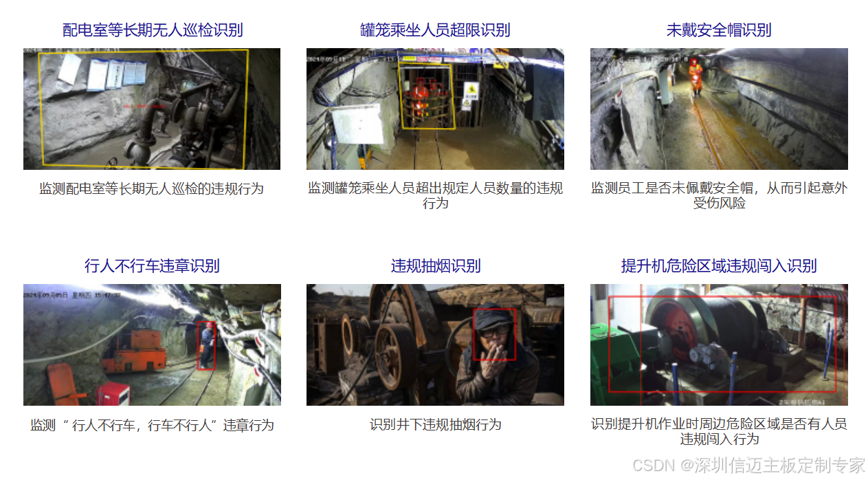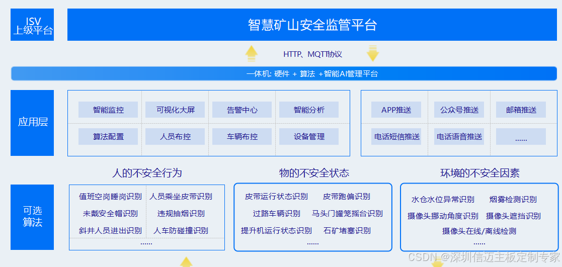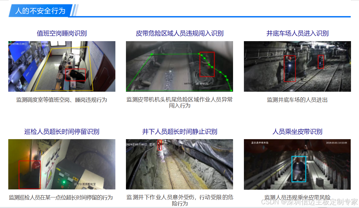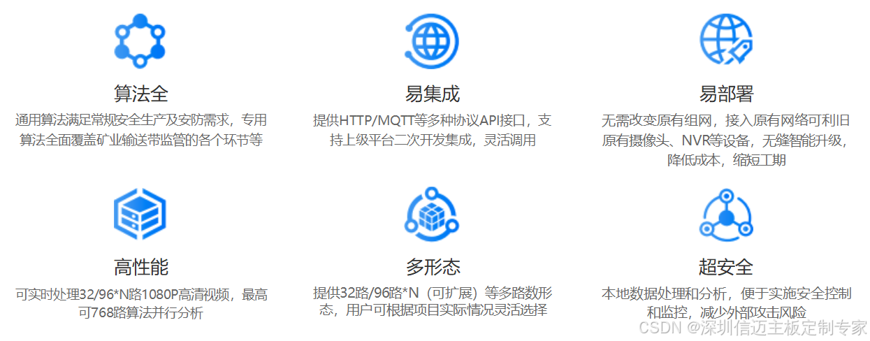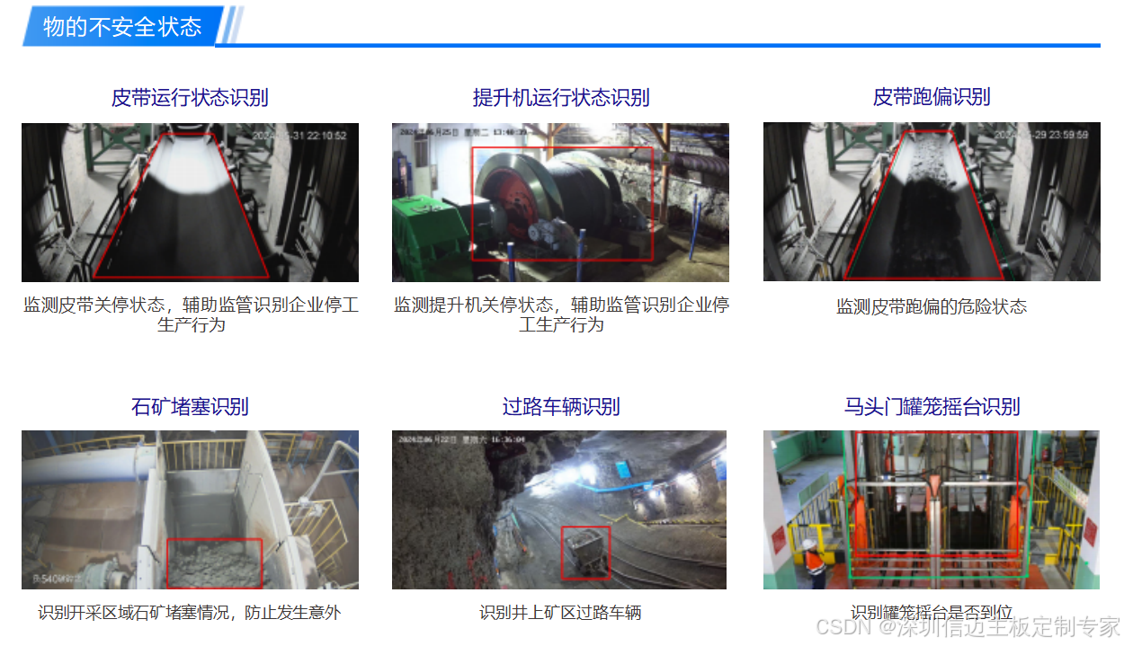 智慧矿山一体机,以防范化解重大安全风险为主线,充分发挥边缘侧视 频智能识别技术优势,面向矿山场景,提供安全监管、设备监测、灾害预警等智能化能力;产品完全符合矿山场景视频智能化 建设技术指导书要求及验收标准。