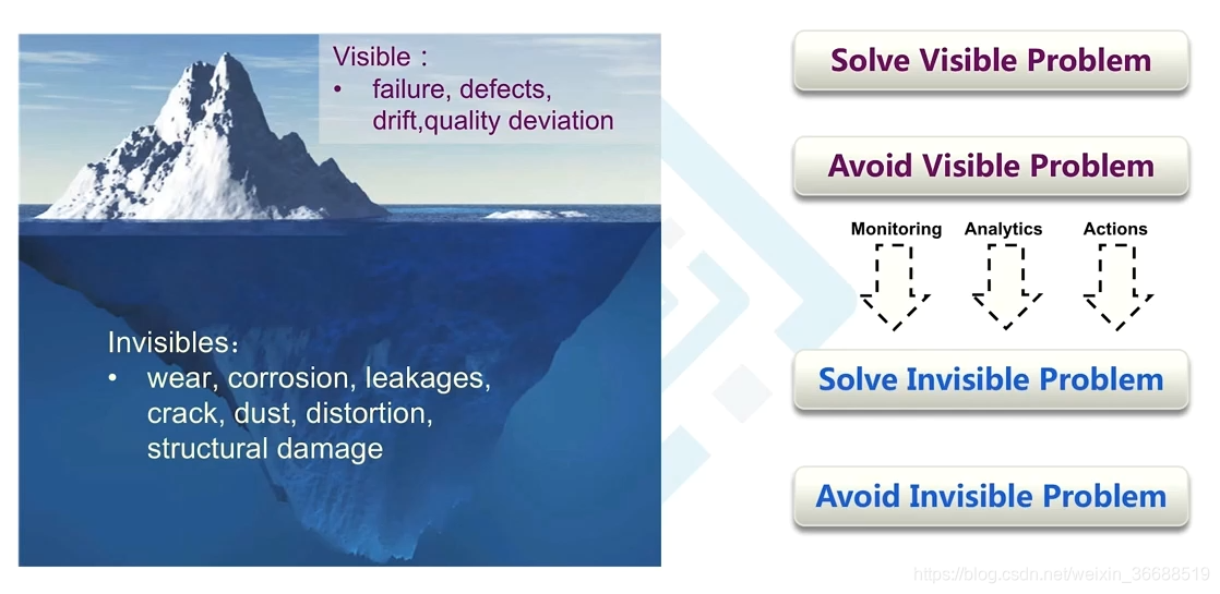 对于这种情况,要从源头入手,能够避免这些问题。因此,维护的一个终极目标并不仅发现这些失效,而是要解决和避免它们。就是要利用监控分析,甚至决策支持这样的手段来去解决和避免看不见的问题。这其实是一个宏观的对维护技术的愿景。如何能够避免不可见问题的发生,很重要的一点就是要做预测。