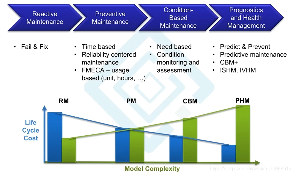 随着维护技术的发展,整个设备生命周期里面的维护成本是逐渐降低的,但是模型的复杂程度会逐渐升高。也就是说系统的智能化程度是不断增大的。以上是PHM技术产生的背景。
