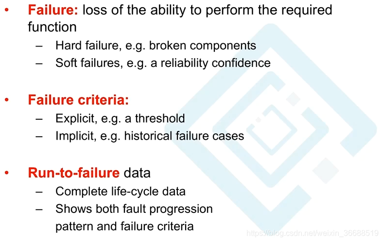 对于失效这个概念,什么是失效?通常大家认为的失效是发生了停机事件,我们称这样的失效为硬失效,通常是组件损坏或设备的停机,甚至可以广义的指产品的不良发生了。软失效指的是我们说设备的可靠性降低,它可能仍然能够运转,但是我们说它已经发生了衰退,可能已经有一些风险了。或者是在生产制造过程中发现out of control,还没有out of spack。要做RUL预测需要得到一个能够被量化失效标准,可能是阈值或是基于历史的失效的事件而得出来的时间段,要根据不同的情况做具体的归类。