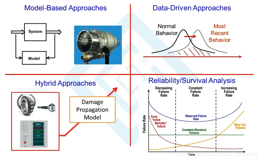 除了数据驱动的方式,还有其他三种不同的方式,有基于机理建模的,这个其实是控制学科里面衍生出来的一些对故障的检测跟分类技术,也有机理跟数据驱动相结合的方式,同时也存在用传统的可靠性统计分析方式来做故障的预测。