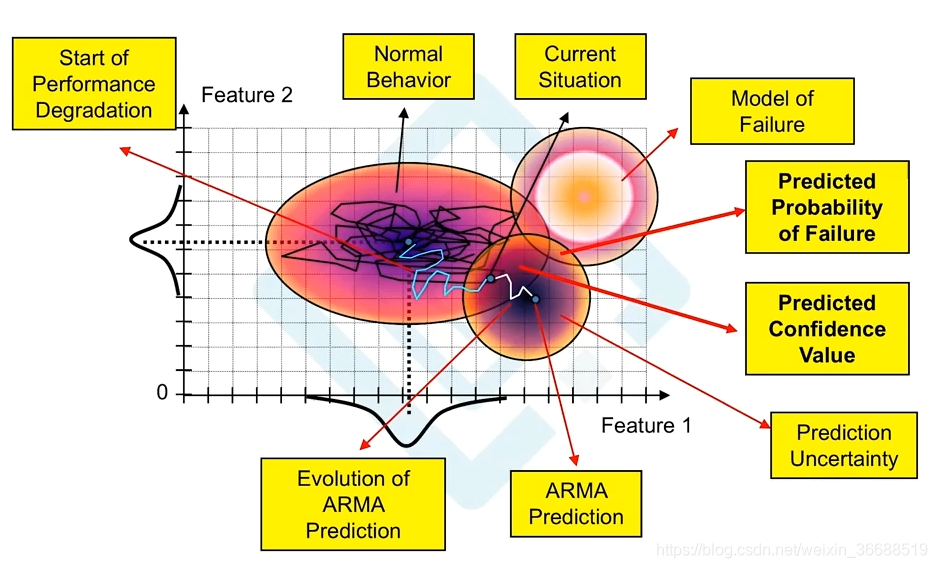 接下来这门课的重点是基于数据驱动的方式来做建模的。基本的示意图如下,在特征空间里面能够看到,如果设备处在健康状态,它会存在于特定的一个分布范围内。如果失效的话,会在这个特征空间里面发生一定的漂移。如果对设备的状态进行监测,就可以预测它什么时候会跑出失效的边界,从而预测它的剩余使用寿命,其实就是用数据驱动的方法做剩余使用寿命预测的方法。预测性建模的理论基础