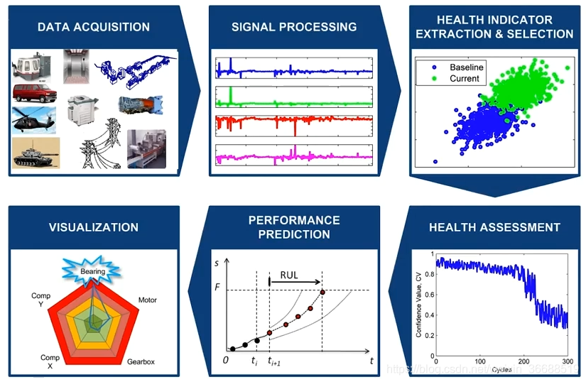不管是实现哪一个层次的PHM的建模方式,步骤的是基本相似的。首先对数据进行采集后,要对信号进行处理,降噪清洗,之后要进行特征提取与特征选择。接下来对系统进行一个健康评估,对它的失效模式进行分类,并且进行健康趋势的使用寿命预测。不管是实现哪一个层次的PHM的建模方式,步骤的是基本相似的。首先对数据进行采集后,要对信号进行处理,降噪清洗,之后要进行特征提取与特征选择。接下来对系统进行一个健康评估,对它的失效模式进行分类,并且进行健康趋势的使用寿命预测。