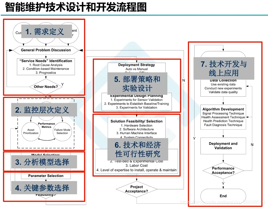 设计一个PHM系统有七个主要步骤,首先,要做一个PHM系统,其实是要判别所面临的对象适不适合做PHM,如果适合,要关注它的哪一类故障模式,是什么样的具体的问题。这个是前期非常重要的要定义出来的需求,这个需求通常是做PHM的数据科学家与终端的用户,甚至要带上设备的制造商一块儿来研讨定义需求。这个需求被定义之后,就要定义监控层次,具体是要做组件级的还是设备级的,是产线级还是工程级的?之后要选择模型,在这个层级的模型选择要定义场景到底是要是强数据弱机理,还是弱机理强数据,甚至是机理跟数据都强,取决于要用哪一个类型的模型。举例来说:机理比较强,但是数据很少,这个时候就要借鉴一些领域知识,尽量用基于机理的模型做数据的分析;有的时候数据量很大,但是对系统不是很了解,这样就比较适合用纯粹的数据驱动的方式来做。接下来就要选择一些关键的参数,这个跟前面定义的需求、业务目标、选择的要监控的关键参数是有非常紧密的关联的。在这一步是要定义到底采集哪些数据,如果没有这样的数据,要外加传感器。如果不能加传感器,就要回到我们的需求定义层次,减少功能。接下来就要做部署策略跟实验设计,也就是说要开始采集一些能够进行可行性分析的数据了。这些数据要能够支撑我们尽量采集完整的工况,并且能够尽量覆盖到不同的失效模式。如果能有全生命周期的数据的话,其实是最好的。第六步,要对技术和经济性的可行性进行一个研究,这个时候已经建完模了,对数据有一定程度的理解跟分析结果后,是能够进行一些对标的分析,然后对应到我们经济性上,分析我们的项目的可行性。如果被证明可行,就要进行实际的线上的技术开发,与上线的应用等部署。设计一个PHM系统有七个主要步骤,首先,要做一个PHM系统,其实是要判别所面临的对象适不适合做PHM,如果适合,要关注它的哪一类故障模式,是什么样的具体的问题。这个是前期非常重要的要定义出来的需求,这个需求通常是做PHM的数据科学家与终端的用户,甚至要带上设备的制造商一块儿来研讨定义需求。这个需求被定义之后,就要定义监控层次,具体是要做组件级的还是设备级的,是产线级还是工程级的?之后要选择模型,在这个层级的模型选择要定义场景到底是要是强数据弱机理,还是弱机理强数据,甚至是机理跟数据都强,取决于要用哪一个类型的模型。举例来说:机理比较强,但是数据很少,这个时候就要借鉴一些领域知识,尽量用基于机理的模型做数据的分析;有的时候数据量很大,但是对系统不是很了解,这样就比较适合用纯粹的数据驱动的方式来做。接下来就要选择一些关键的参数,这个跟前面定义的需求、业务目标、选择的要监控的关键参数是有非常紧密的关联的。在这一步是要定义到底采集哪些数据,如果没有这样的数据,要外加传感器。如果不能加传感器,就要回到我们的需求定义层次,减少功能。接下来就要做部署策略跟实验设计,也就是说要开始采集一些能够进行可行性分析的数据了。这些数据要能够支撑我们尽量采集完整的工况,并且能够尽量覆盖到不同的失效模式。如果能有全生命周期的数据的话,其实是最好的。第六步,要对技术和经济性的可行性进行一个研究,这个时候已经建完模了,对数据有一定程度的理解跟分析结果后,是能够进行一些对标的分析,然后对应到我们经济性上,分析我们的项目的可行性。如果被证明可行,就要进行实际的线上的技术开发,与上线的应用等部署。