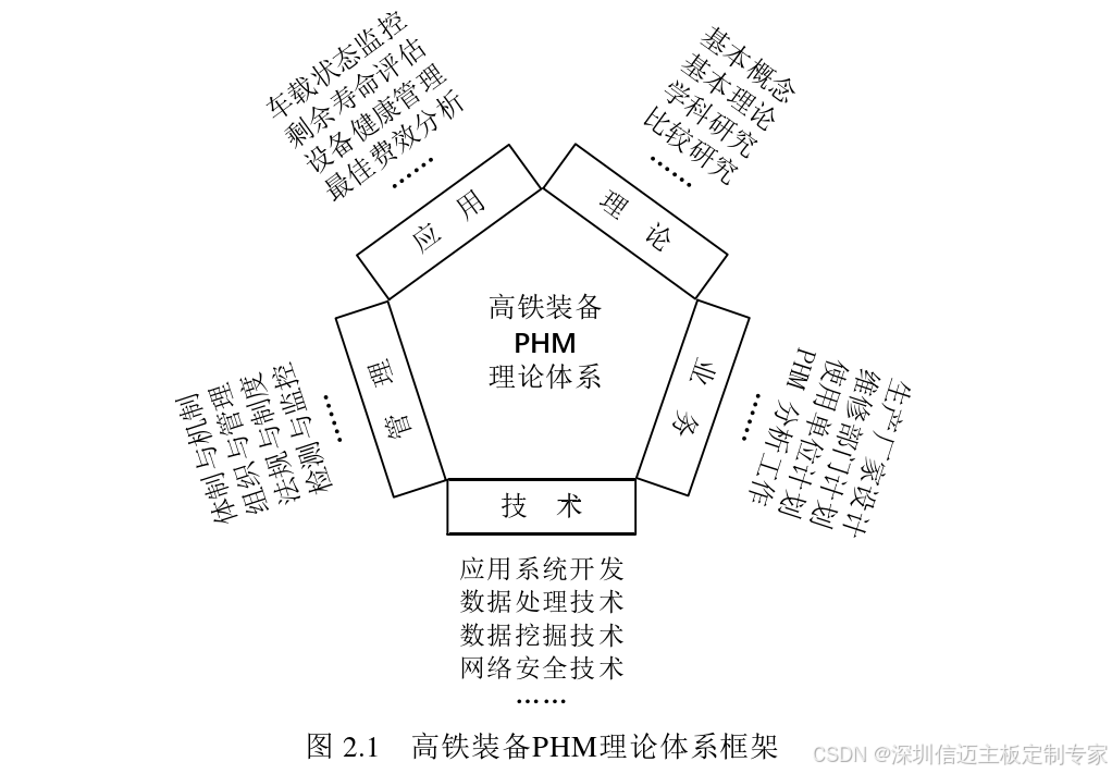 随着高铁装备的集成化、智能化及列车 控制 网络的发展,高速动车组关键部 件状态监控和数据传输功能的不断完善,以及故障 预测 与健康管理系统的逐步应 用[41,43,60],使高铁装备建立故障预测与健康管理理论体系成为可能。目前国内尚 未形成一套有关高铁装备PHM理论体系。本文探索性地提出高铁装备PHM理论参 考体系。高铁装备PHM理论体系由五大系统组成,它们分别是高铁装备PHM理论 系统、高铁装备PHM业务系统、高铁装备PHM技术方法、高铁装备PHM管理系统 和高铁装备PHM应用系统,如图2.1所示。
