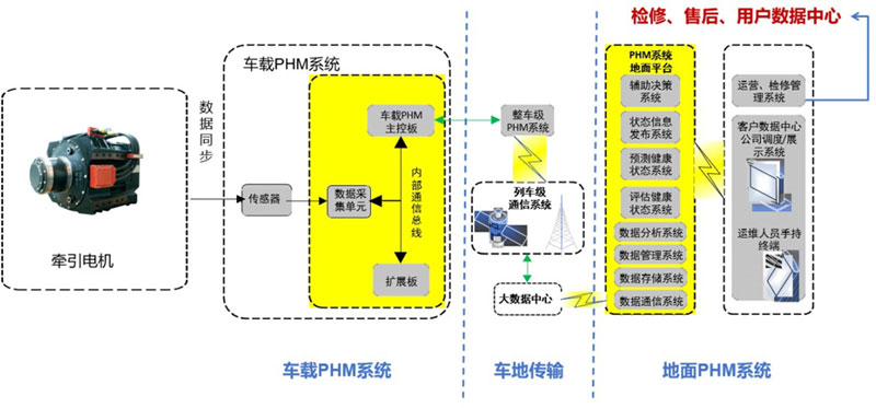 牵引电机健康管理单元(PHM)用于监测牵引电机的轴承状态和故障预测。通过复合传感器(温度+振动),采集牵引电机轴承的振动加速度、温度,接收速度信号,通过牵引电机PHM车载单元硬件和内嵌的软件相配合,实现对牵引电机轴承数据自动采集、数据处理、存储、特征量计算、故障预警、数据传输等功能。