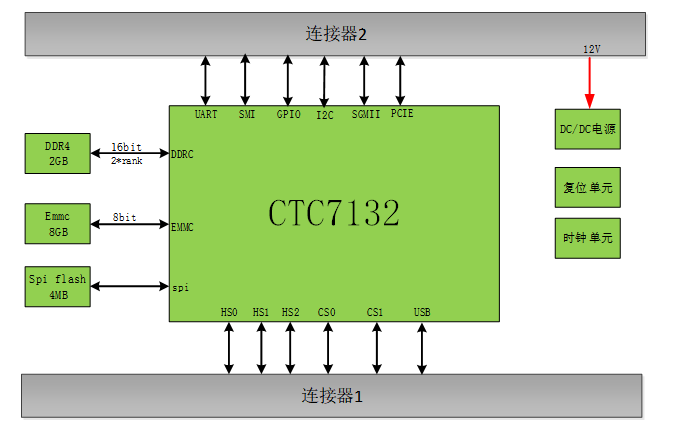 核心板硬件方案主要由CTC7132 SOC系统、电源、时钟等几个系统部分组成,通过板对板高速连接器引出32路10G SerDes接口、2路管理SGMII接口、1路PCIE2.0 X1接口、3路Uart接口、4路I2C接口、5路SMI接口、1路100MHz PCIe 差分参考时钟输出接口、1路串行点灯信号组以GPIO信号等,具体实现框图如下。