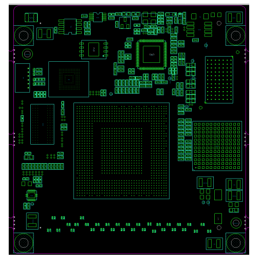 核心板PCB尺寸为80mm×75mm×2mm(板厚),核心板与载板匹配合高为8mm。TOP面散热设计需结合实际应用场景考虑,外形示意图如下所示,详见 DXF文件 。