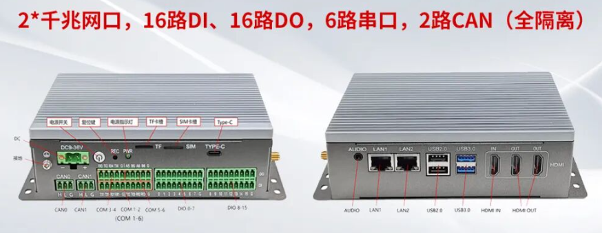 **应用价值凸显:**以6路串口整合3组集中式逆变器集群,16路DI/DO全覆盖配电房32路开关状态,双 CAN 总线实现储能PCS指令毫秒级响应;可同时接入8个安防监控摄像头,更通过8路MIPI接口接入红外相机,依托6TOPS NPU实时分析4万㎡组件区热斑风险(识别准确率97.2%),年预防发电损失大幅降低。
