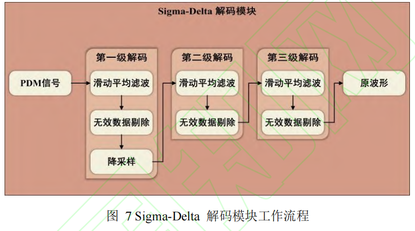 PDM 信号解调为具有物理意义的多比特数字信号,流程如图 7 所示。该模块的设计理念和工作原理