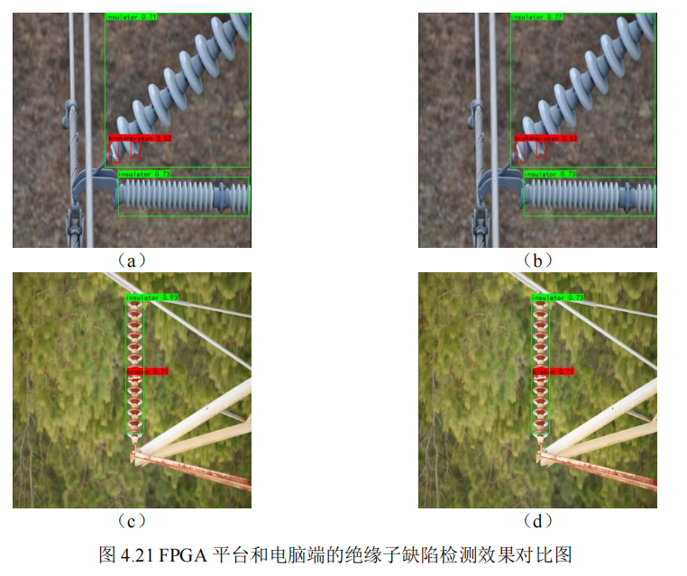上进行绝缘子缺陷检测的效果,其中图(a)与(c)为 FPGA 平台下的检测效果,图