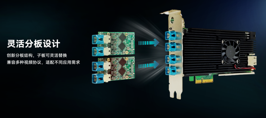多功能图像采集卡支持最高16通道图像输入,支持零拷贝PCIe高带宽传输,并通过可更换子板的分板设计,能够适配多种视频协议,如GMSL、FPD-Link、MIPI等,真正实现一卡多用。用户可根据实际场景需求——如多目视觉检测、环绕感知系统或广域安防监控,灵活配置输入路数和接口类型,显著降低系统复杂性与集成成本,尤其适用于需高通道数量的工业自动化和智能交通场景。