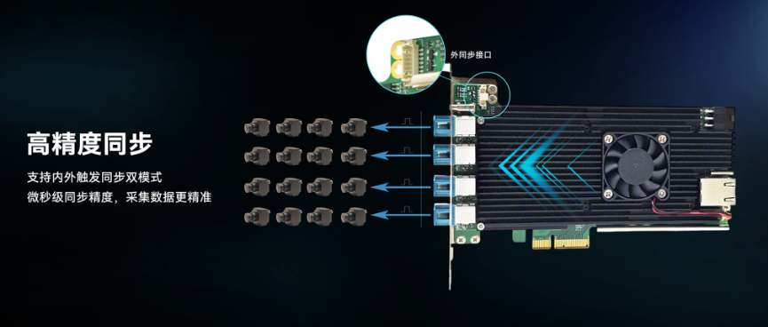 **高精度同步:**支持内外同步功能,同步精度达微秒级别,确保多通道采集一致性。