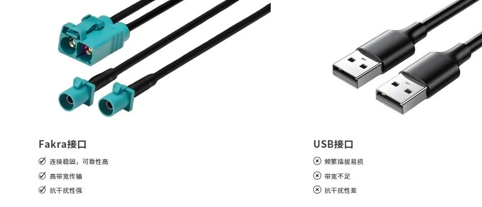GMSL 摄像头采用的Fakra 接口更为牢固,这是一种高性能射频同轴连接器,具有体积小、可靠性高、抗干扰能力强等特点。其独特的螺旋式连接方式,能够实现快速、稳固的插拔,相比传统接口,连接时可有效避免因震动、外力拉扯导致的松动或脱落,造成图像模糊、数据传输中断等问题,维持图像采集和传输的稳定性。