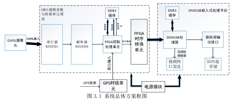 3.1 系统总体方案及工作原理 3.1.1 系统总体方案 基于 GMSL 的车载视频采集与存储系统总体方案框图如下图 3.1 所示,主要由 GMSL 视频采集与转换单元、DM8168 嵌入式数字视频采集单元、 GPS 时统单元和电 源模块共四个功能模块构成。 其中,系统核心处理平台采用 FPGA+DM8168 架构,整个硬件系统由 FPGA 处理 器、DM8168 异构多核 SoC 片上系统、外围接口电路和各功能模块电路组成。 图 3.1 系统总体方案框图 各功能模块的主要功能如下: (1)GMSL 视频采集传输链路单元 GMSL 视频采集传输链路单元模块主要包括 GMSL 串行器、GMSL 解串器、FPGA 控制器、DDR3 缓存单元和 FPGA 接口时序转换模块等子模块。其主要功能是将 GMSL 相机采集的视频数据通过 GMSL 链路传输,由 FPGA 对视频数据进行时标叠加,然后 通过FPGA接口时序转换模块完成对视频数据接口转换方便后端处理器对视频信号数 据进行采集处理。 (2)DM8168 嵌入式数字视频采集单元 DM8168 嵌入式数字视频采集单元模块主要包括 DM8168 处理器、SATA 盘存储 模块、网口发送模块和 DDR3 缓存单元。DM8168 处理器负责对 FPGA 输出的数字视 频信号进行采集,然后对视频数据作图像处理。SATA 存储模块负责将原始视频数据 存储到 SATA 电子盘。网口发送模块主要是利用千兆以太网将 DM8168 处理器压缩编码后的视频数据发送到上位机。