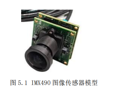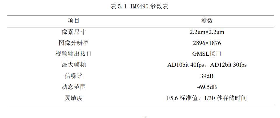 5.1 系统测试 实验 平台搭建 根据课题项目的要求,本系统要求能获取高分辨率的高清图像,并采用 GMSL 接 口输出。因此本系统选用索尼公司生产的 IMX490-GMSL 摄像头作为原始视频采集的 图像传感器,图像传感器模型如图 5.1 所示。IMX490 是 CMOS 图像传感器,支持输 出最大分辨率可以达到 2896×1876,约 540 万有效像素。使用千兆多媒体串行链路串 行器和解串器技术,支持使用 GMSL 接口时序输出图像数据。而且该 GMSL 相机还 能够对采集的视频图像进行补偿,支持伽玛曲线、白平衡、饱和度、色度等基础处理。 可以根据不同的分辨率配置 寄存器 参数,GMSL 相机输出的视频图像的帧率可以在 30-60 帧范围内可调。相机工作在正常状态时的实际功率在 150mW-200mW 范围内波 动是正常的。