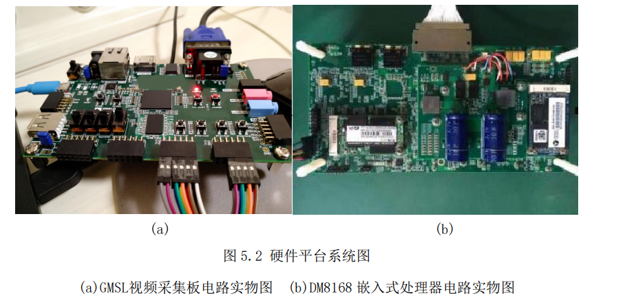 选好相机的型号后,根据第三章设计的系统设计方案搭建实验平台,搭建好的实 验电路如图 5.2 所示,左边电路图(a)是 GMSL 视频采集与接口转换电路单元,该 单元负责对 GMSL 接口输出的视频图像进行时标叠加和接口时序变换;右边电路图(b) 是对视频进行采集与存储的 DM8168 嵌入式处理单元,该单元主要负责对 GMSL 视 频数据进行原视频存储与压缩编码,并将压缩编码的视频数据通过网络传输。然后通 过实验平台模拟对车载视频的采集与存储验证并记录实验的效果和实验的相关数据。