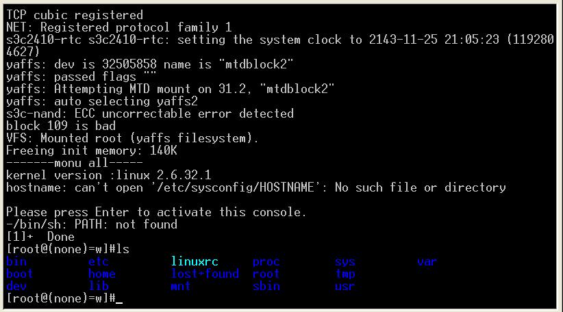 yaffs: dev is 32505858 name is "mtdblock2"yaffs: passed flags ""yaffs: Attempting MTD mount on 31.2, "mtdblock2"yaffs: auto selecting yaffs2s3c-nand: ECC uncorrectable error detectedblock 109 is badVFS: Mounted root (yaffs filesystem).Freeing init memory: 140KWarning: unable to open an initial console.