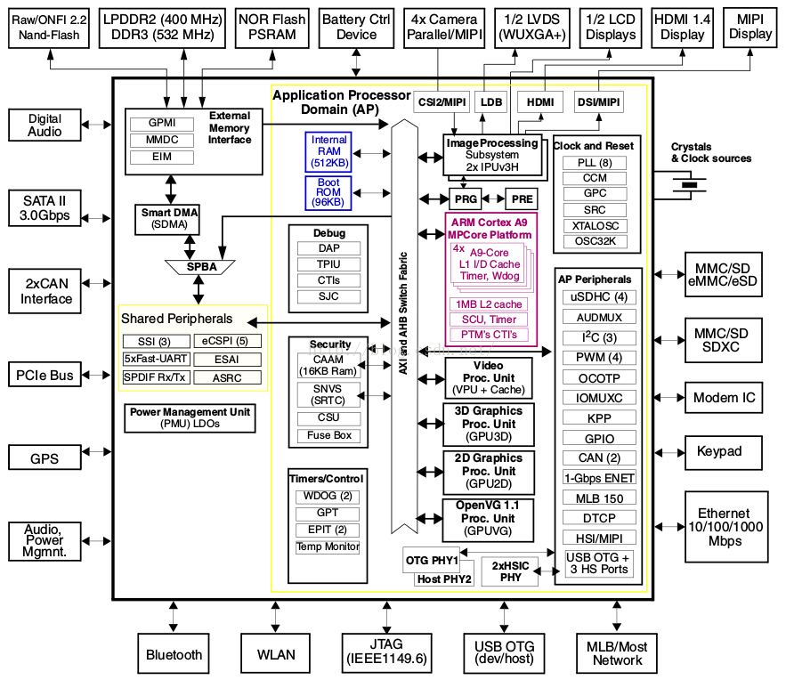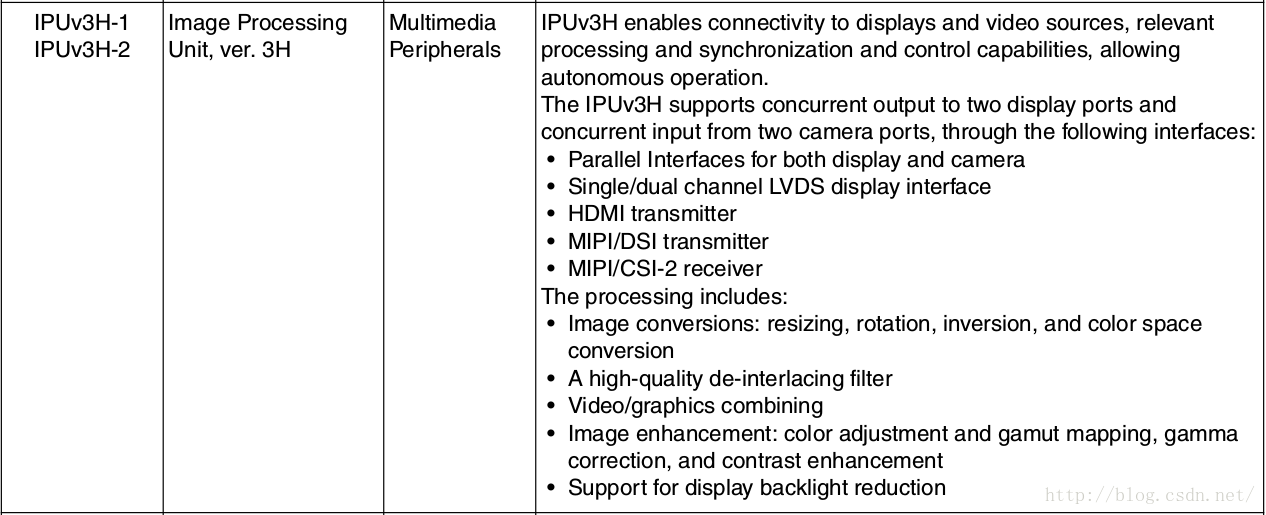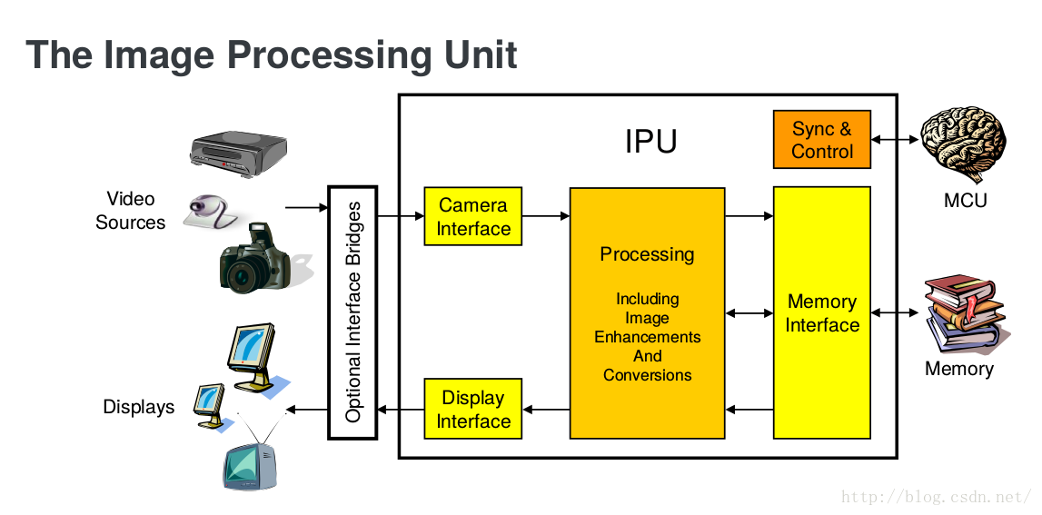 可以看出来,整个IPU挂接在 AXI 与AHB总线上面,通过总线,它可以与ARM,VPU,GPU和RAM等模块通信。